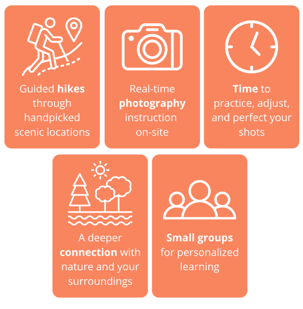 A Photo Hiking Tour blends outdoor exploration with hands-on photography coaching. Unlike typical sightseeing tours, we slow down to focus on light, composition, and storytelling — turning every trail into a creative classroom.